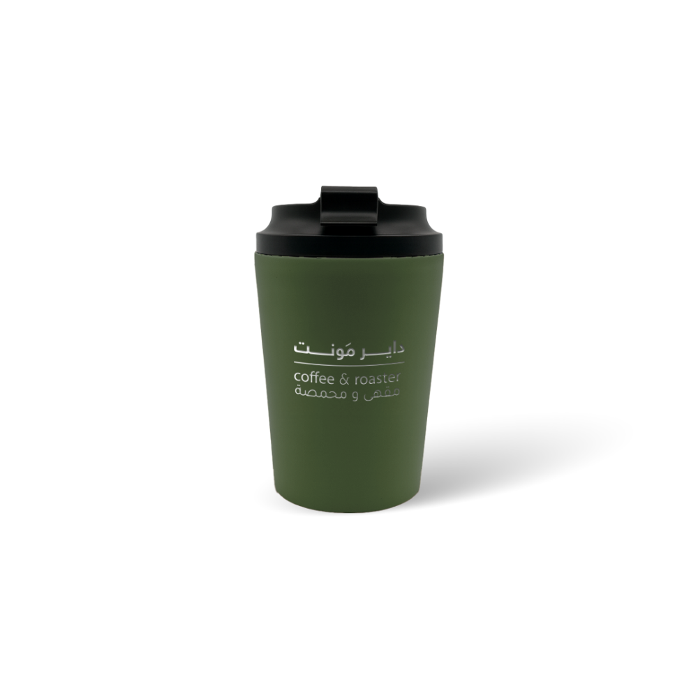 كوب بلون زيتي عميق من ستانلس ستيل مزدوج الجدار، يعزل الحرارة بكفاءة ويحافظ على مشروبك البارد 12 ساعة والحار 8 ساعات. سعة 360ml، غطاء محكم. الشعار محفور على الكوب بكل فخر — منتج يمثل دايرمونت، من المحصول إلى الكوب، بنفس الجودة والاعتزاز. يجي داخل علبة تغري أي محب للقهوة.